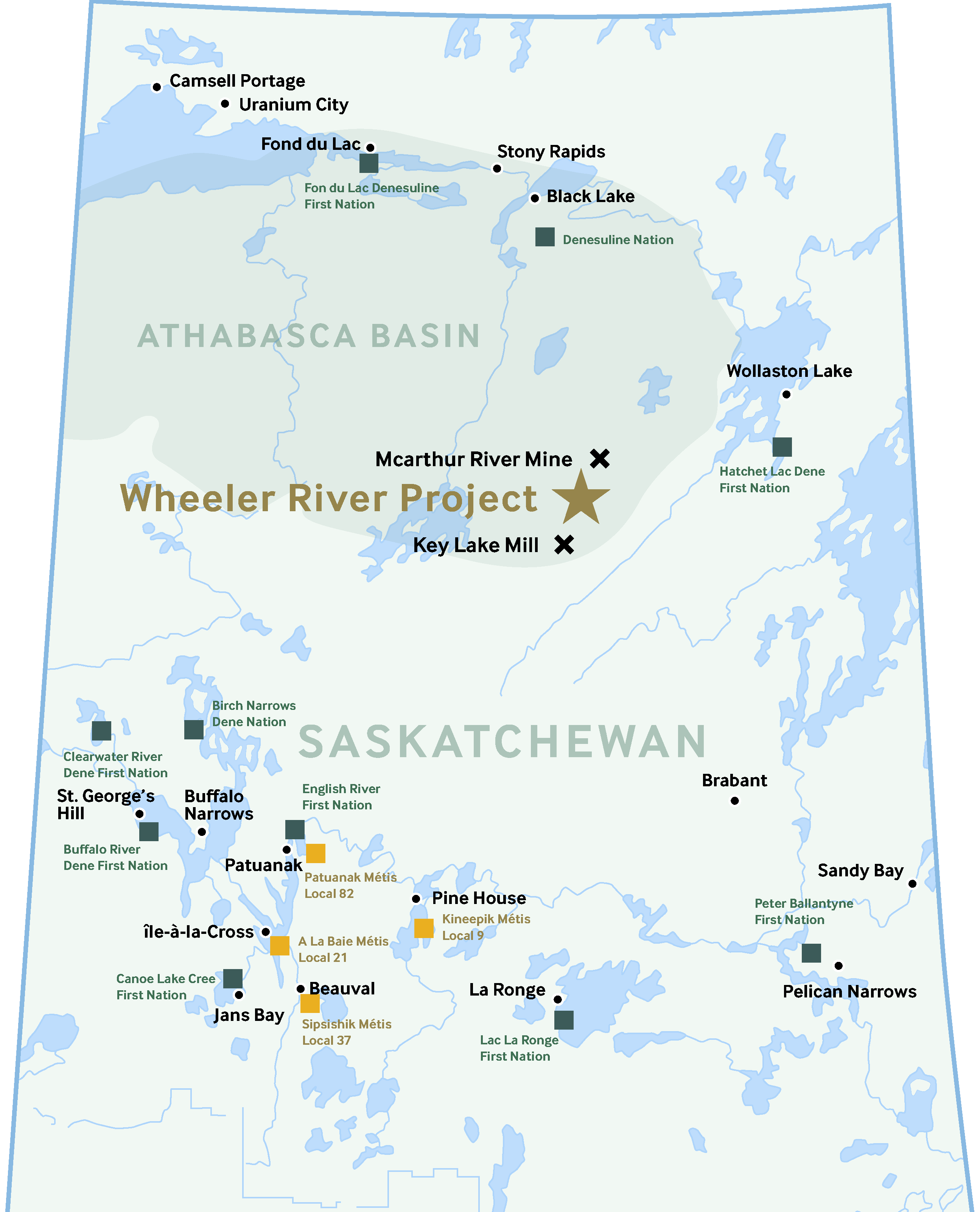 The Wheeler River Project is situated in the eastern portion of the Athabasca Basin region in northern Saskatchewan, and it is the site of a proposed In Situ Recovery (ISR) uranium mining project. It is located 35 km north-northeast of the Key Lake mill and 35 km southwest of the McArther River uranium mine, within the traditional territory of several Indigenous communities. Denison Mines holds an effective 95% ownership and operates the project with a deep commitment to collaboration—working closely with Indigenous groups and local communities to build a legacy of responsible development.